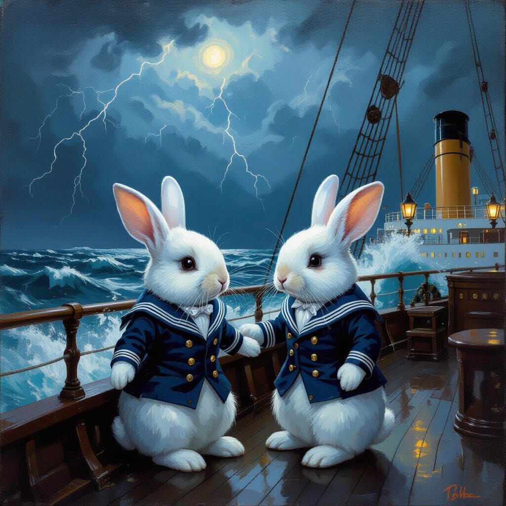 An oil painting depicts two bunnies in sailor outfits on the Titanic's deck during a stormy night. Dramatic waves and lightning illuminate the scene with moody lighting.
