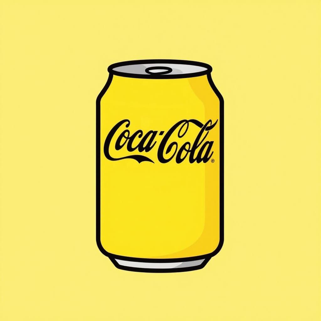 A flat, 2D illustration of a yellow Coca-Cola can against a yellow backdrop, featuring thin black outlines in a minimalist style.