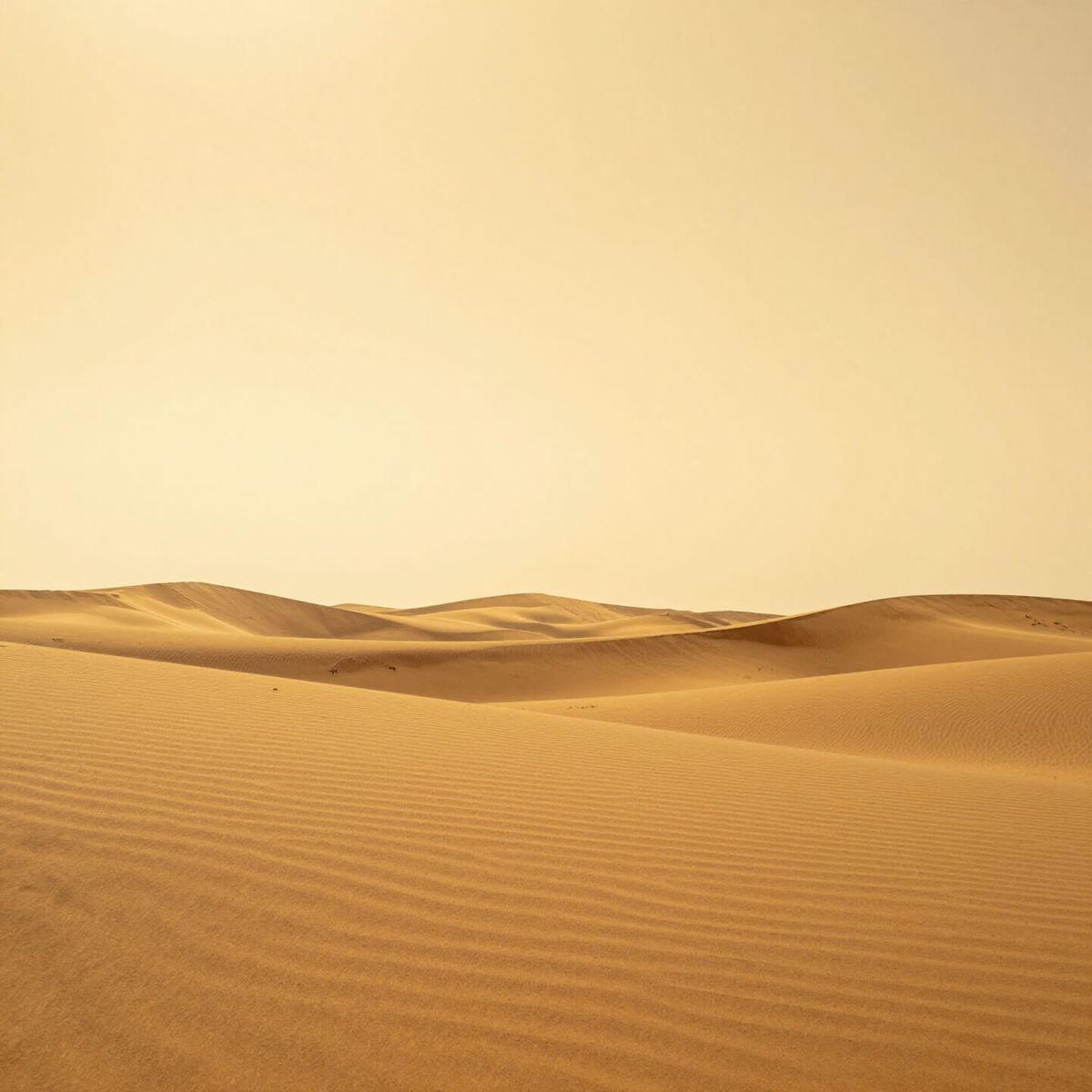 This image features a minimalist abstract landscape with two horizontal bands: golden sand dunes below and a clear yellow sky above. The composition emphasizes extreme simplicity and mathematical precision, evoking infinite space.