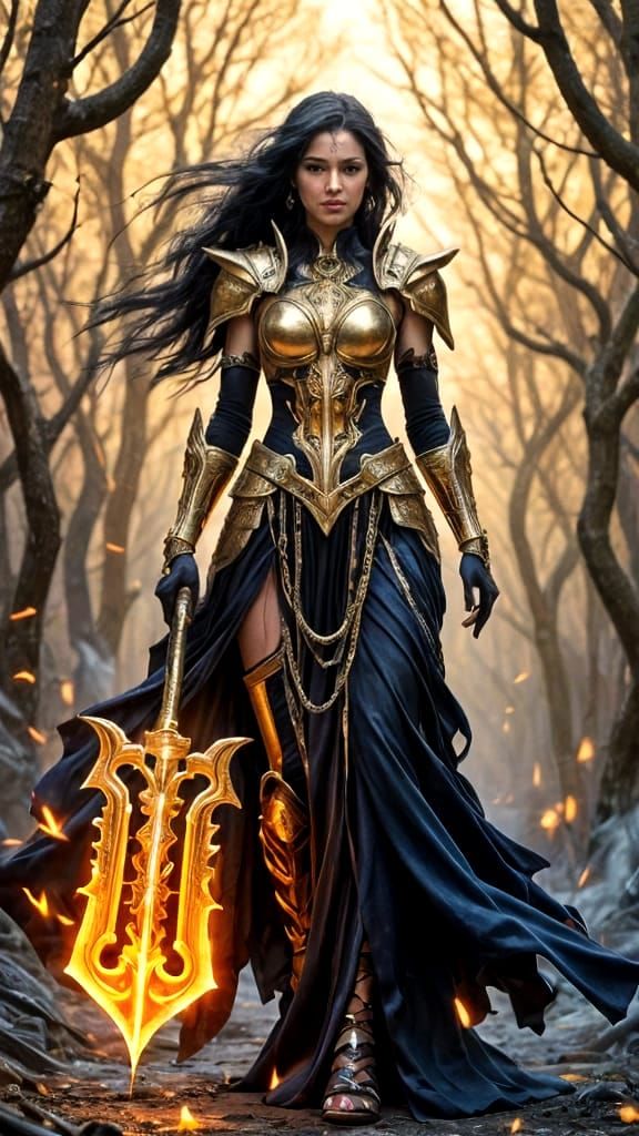 A stoic warrior queen stands in a leafless forest corridor, clad in ornate etched armor over a dark flowing gown. Her wind-tossed hair frames a calm, unshaken gaze as she grips a radiant golden crescent blade that flares like captured firelight in the misty dusk.