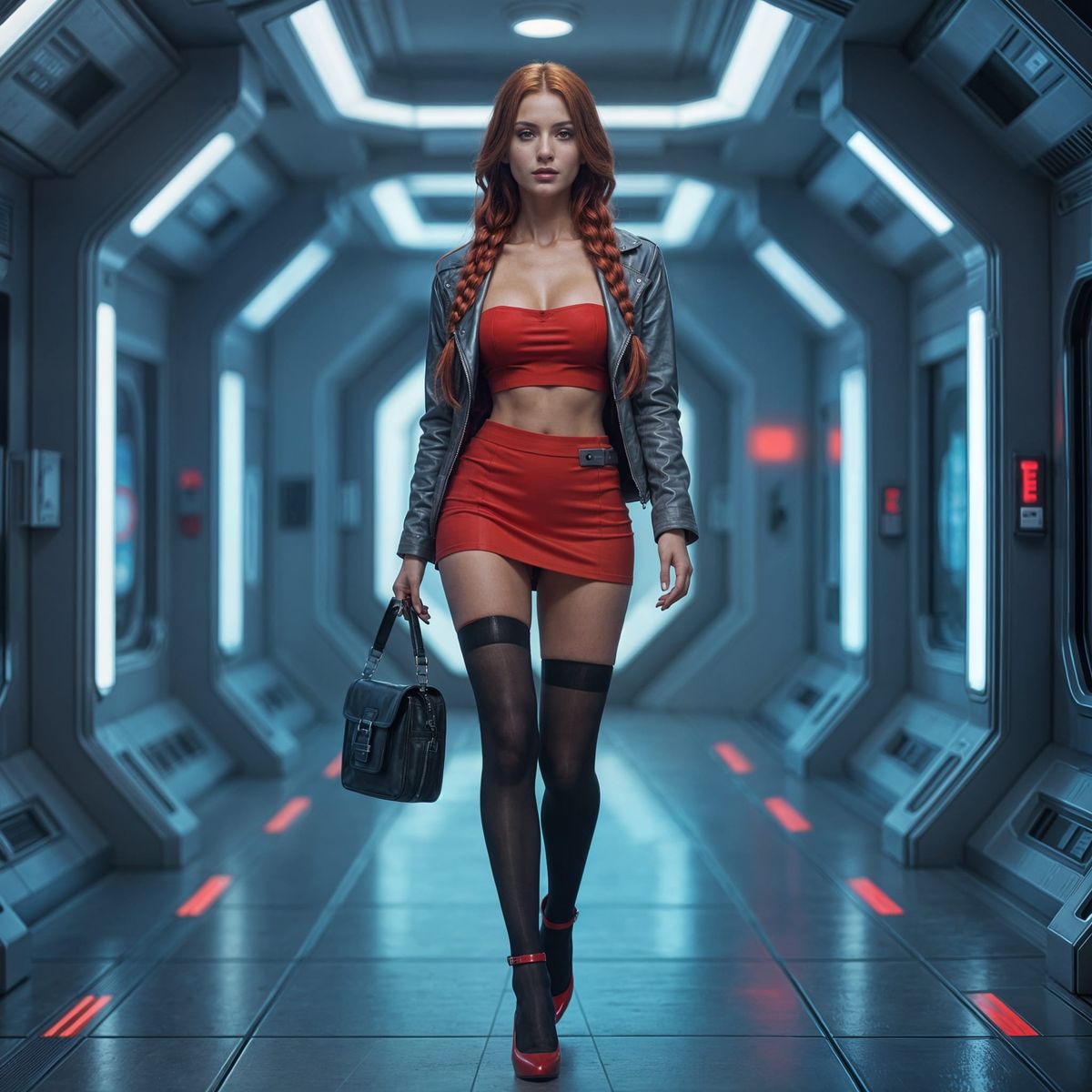 This photorealistic image shows a woman with red hair in a braid, wearing a red miniskirt and thigh-highs, walking through a futuristic space station. Rendered in a matte finish with Unreal Engine 5.