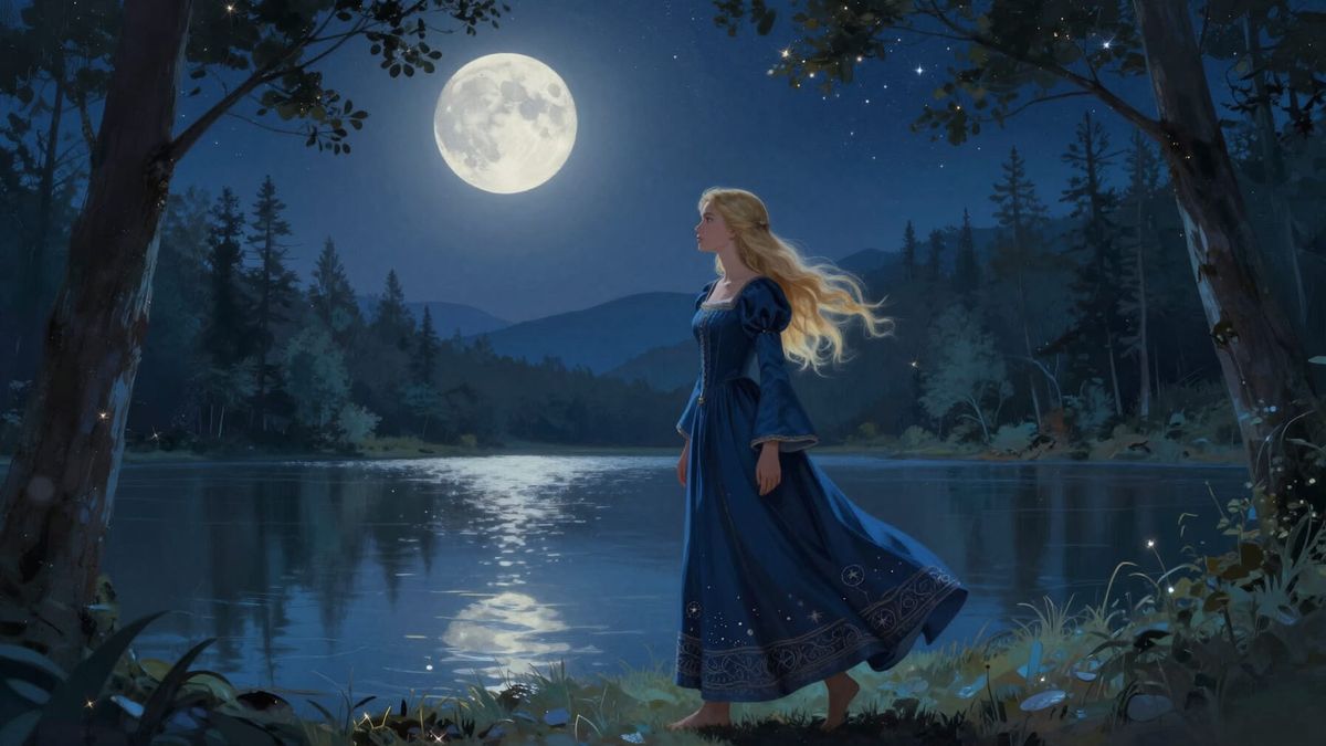 This image shows a serene fantasy illustration of a blonde woman in a medieval maid dress by a moonlit forest lake. Features painterly digital art with soft gradients and a cool color palette.
