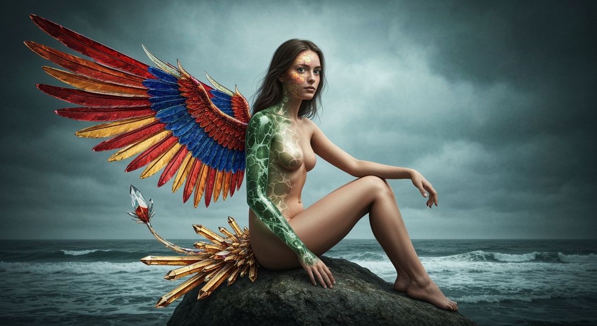 This surreal digital painting depicts a girl by a stormy sea, her body becoming glass. She has glass phoenix wings and crystal tail, with hyperrealistic detail and a moody atmosphere.