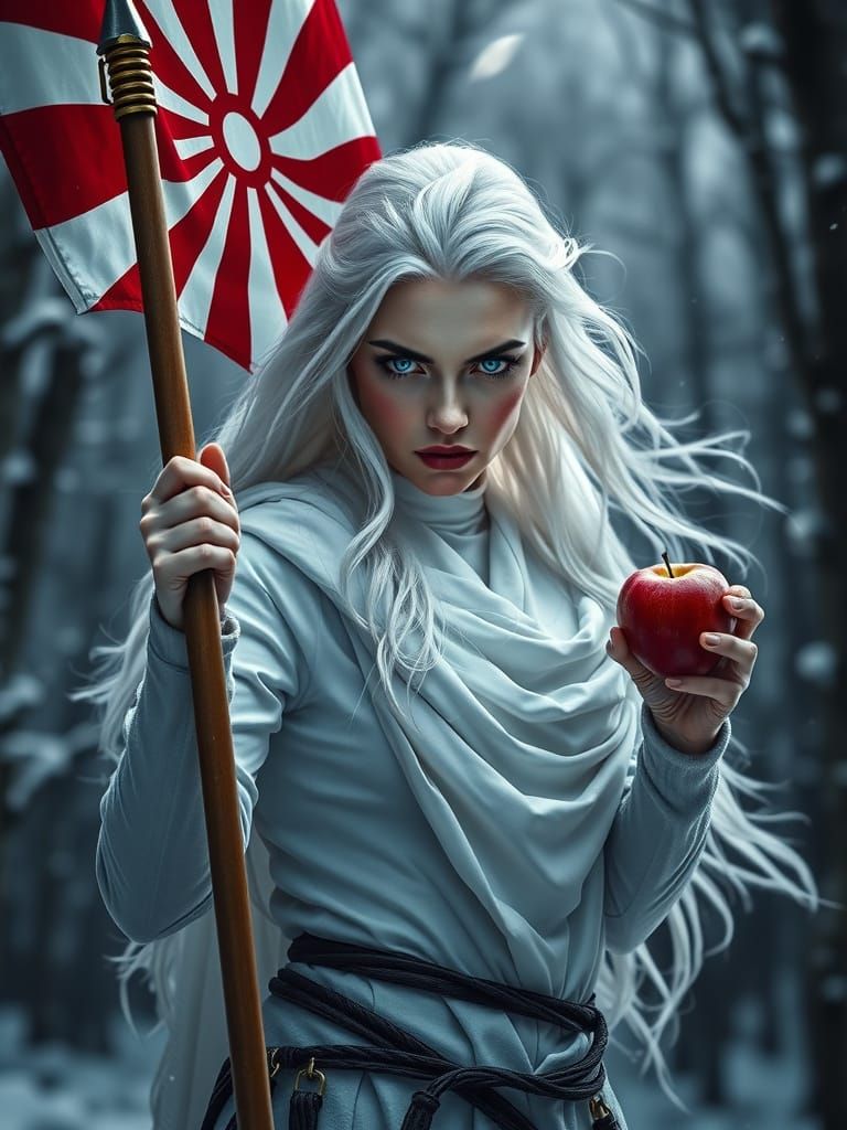 This hyperrealistic image shows a terrifying warrior with white hair and clothes, holding the Macedonian flag and an apple. She stands in a snowy forest with intense, angry eyes.