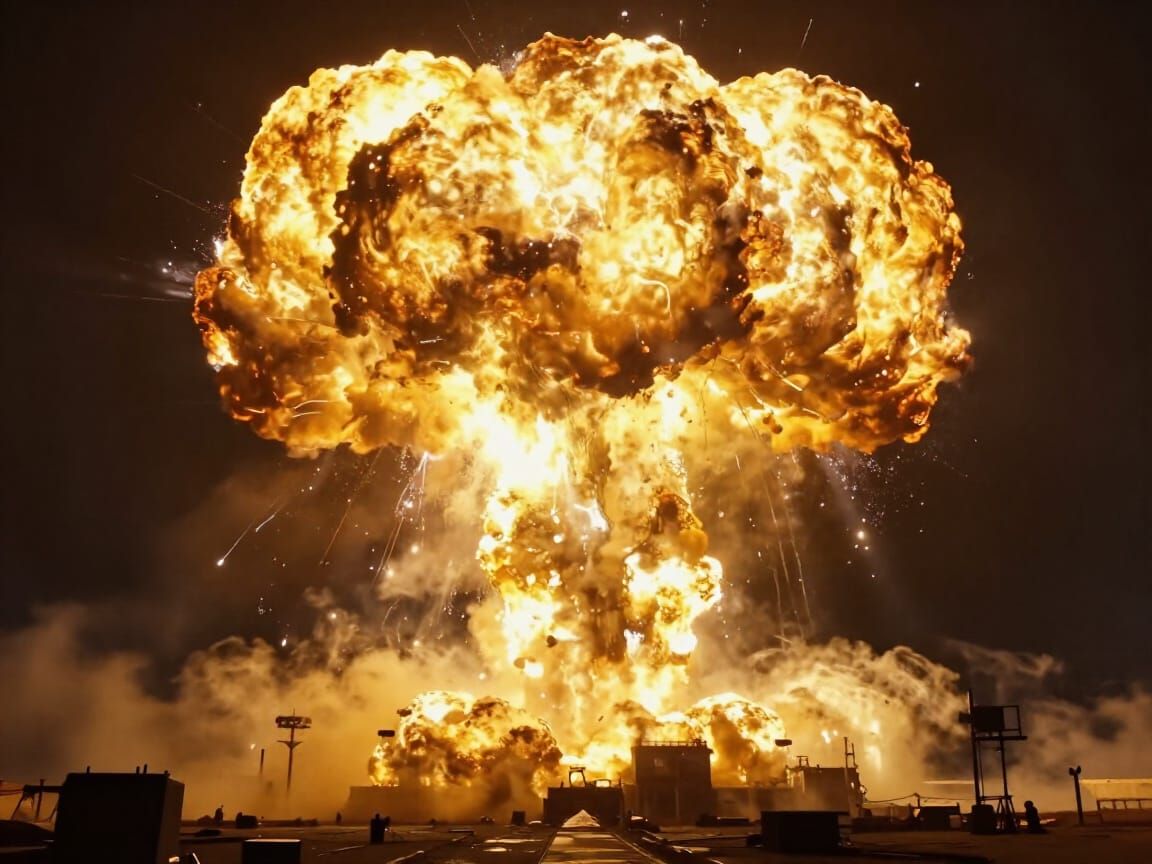 This image showcases a colossal nuclear explosion rendered in a detailed matte painting style with intense yellow hues and deep, fantastical colors. Concept art emphasizes the awe-inspiring spectacle.