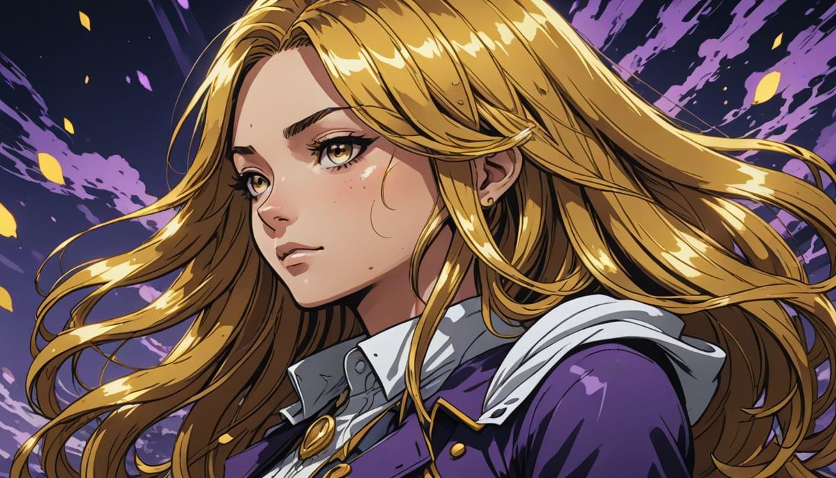 This image shows a beautiful girl with golden hair near a brook. The artwork is in a comic book style, reminiscent of manga and anime, with deep colors and cel-shaded rendering.