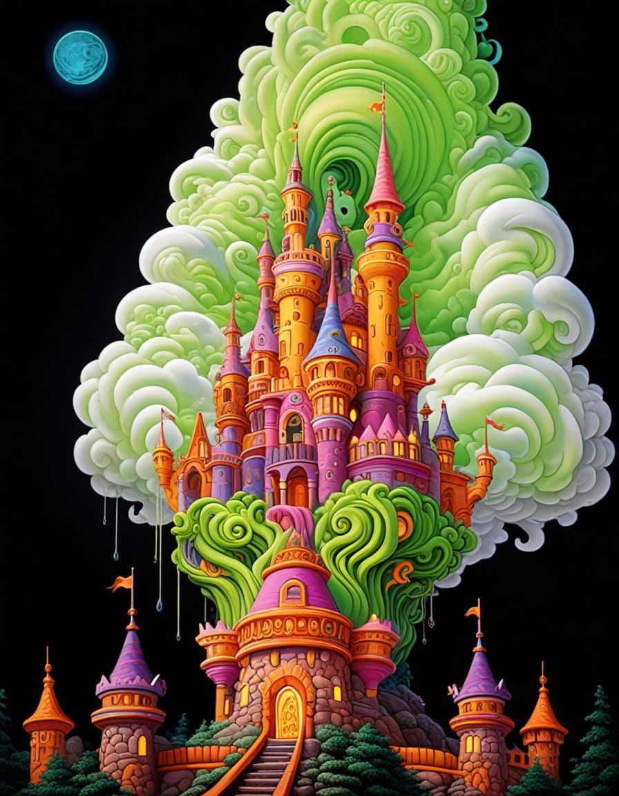 A close-up, ultra-wide shot of Castle Frankula Tranqula in a lowbrow art style. Neon colors glow amidst swirling abstract patterns and a bright, misty atmosphere in this vibrant, surreal digital art piece.
