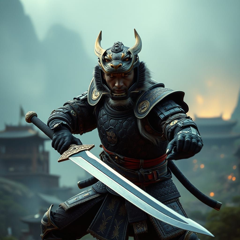 A striking picture of a tiger warrior in Chinese armor, set in a mystical landscape. The image features cinematic lighting and warm color grading, reminiscent of dramatic fantasy art.