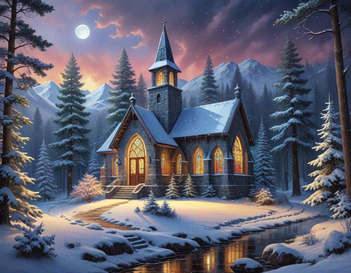 This image shows a stone chapel on Christmas Eve, bathed in moonlight. Snow-covered pines surround it, and its stained-glass windows emit colorful light, in a detailed watercolor style.