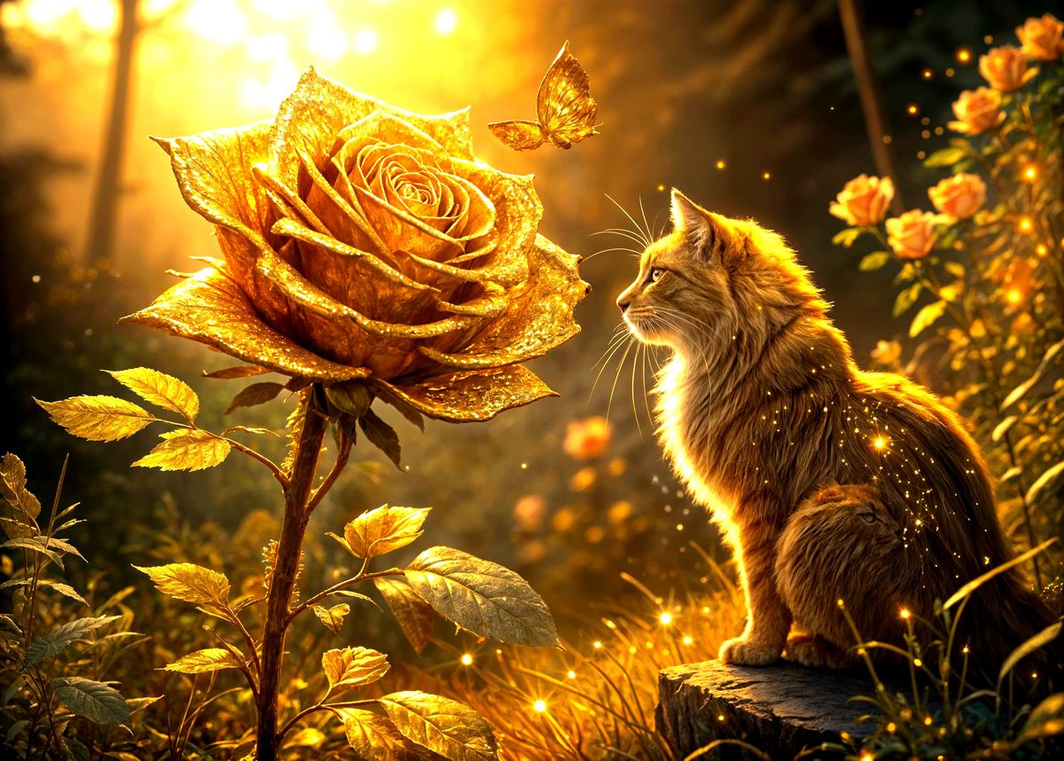 This image shows a golden rose with intricate details, bathed in golden sunlight. In the background, a golden cat sits amidst a golden garden filled with golden roses, creating a mystical scene.