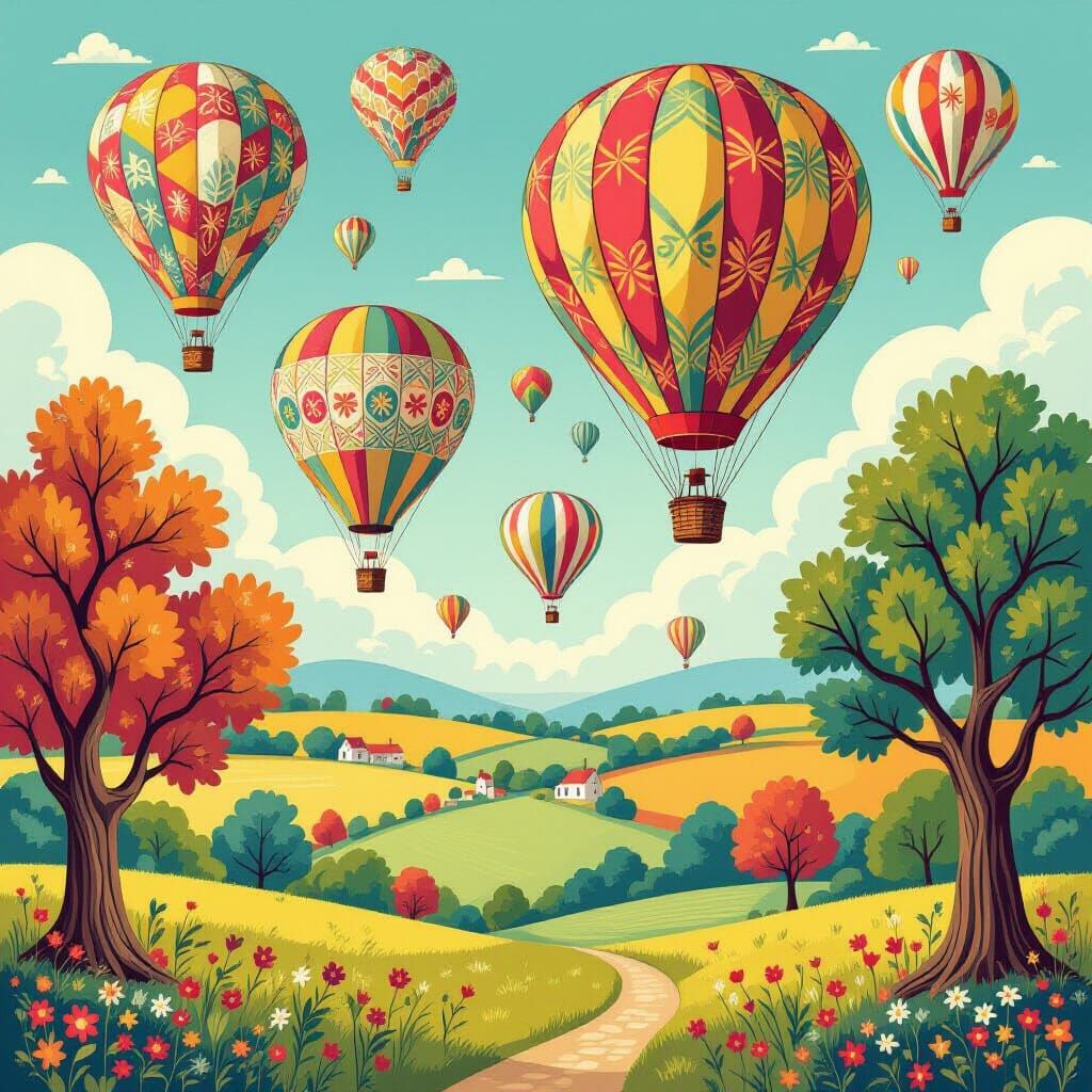 This image shows a vibrant carnival in the English countryside featuring hot air balloons and twisted trees. The scene is rendered with flat colors in a whimsical storybook style.