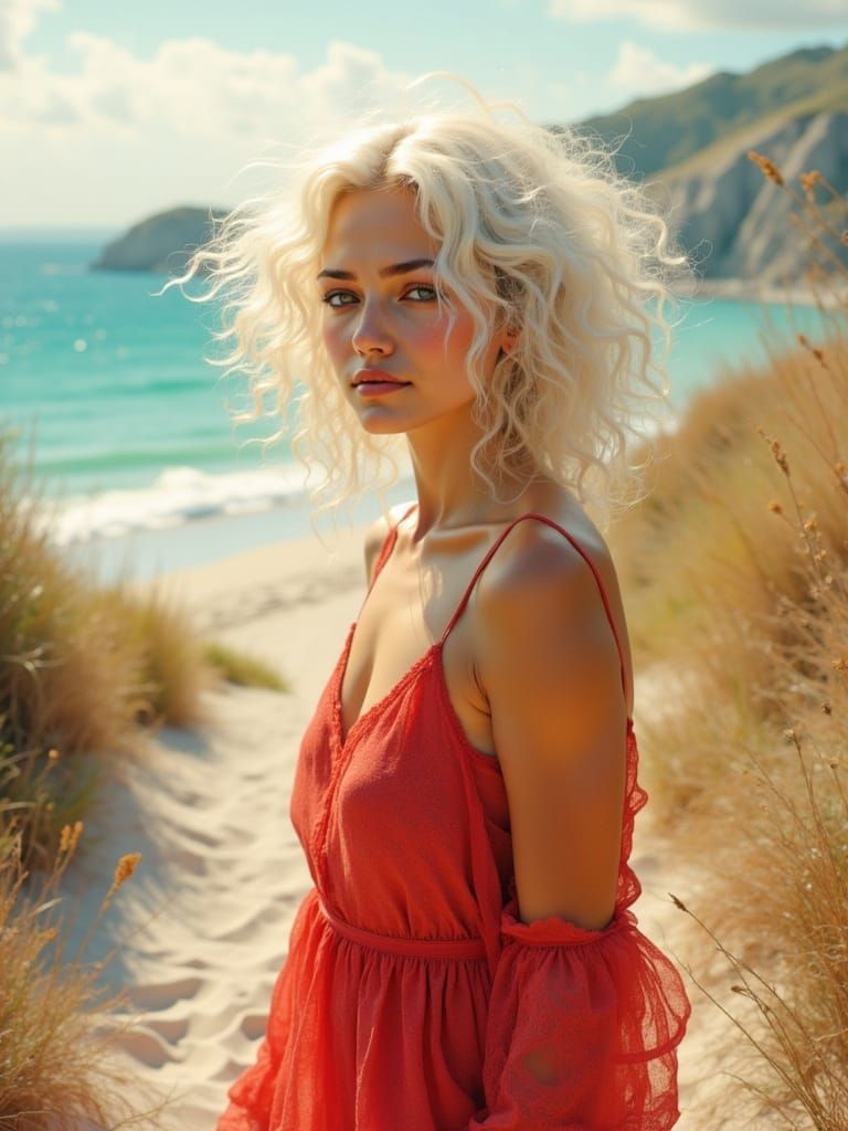 A full body shot of a woman with curly white hair on a boardwalk. The hyperrealistic, ethereal style features dappled sunshine and a muted color palette with crosshatching details.