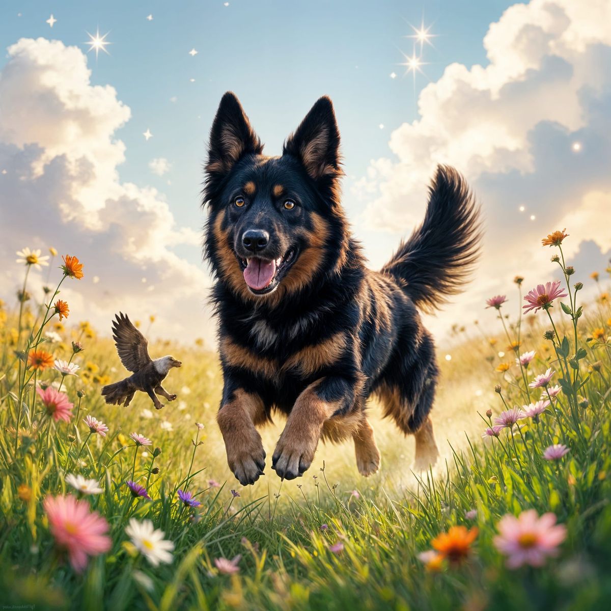 This image shows a black German Shepherd joyfully running through a magical cloud meadow, dropping and chasing its toy eagle. Sunlight and stardust shimmer around the blooming flowers.