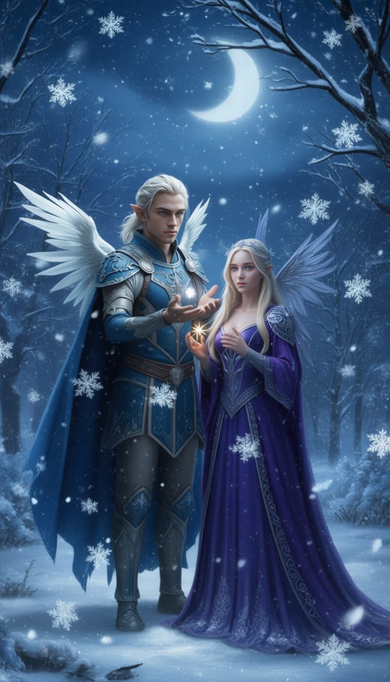 This image depicts a male and female fairy standing together on a cold, snowy night, surrounded by artificial snow.