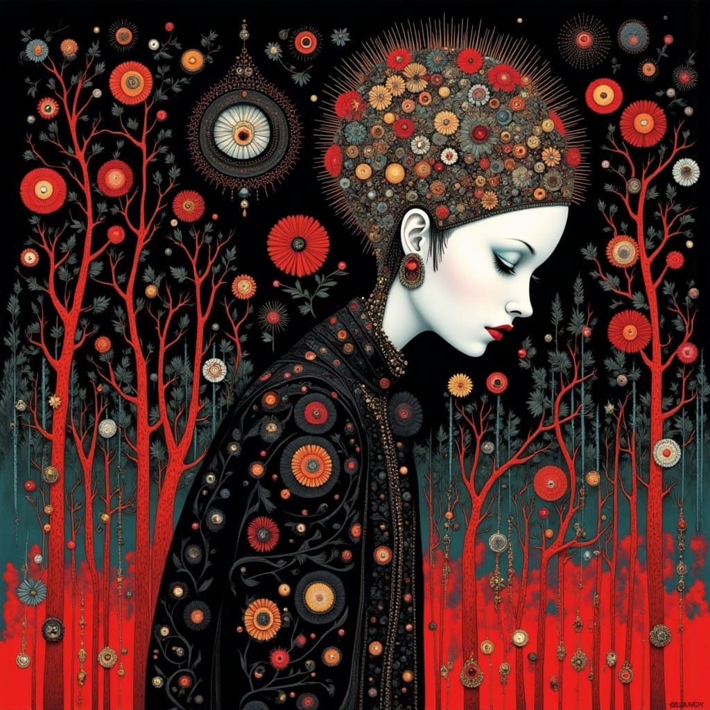 <lora:goth punk flux:1.0>A girl grunge punk fashion high street at night in zentangle art brut style; the palette primarily consists in Black bean, Dried blood, Rosewood, Blood red, Red oxide colors, deep, dark, moody, busy A dreamlike bird in art brut style by Andy Kehoe, Benjamin Lacombe, Catherine ...