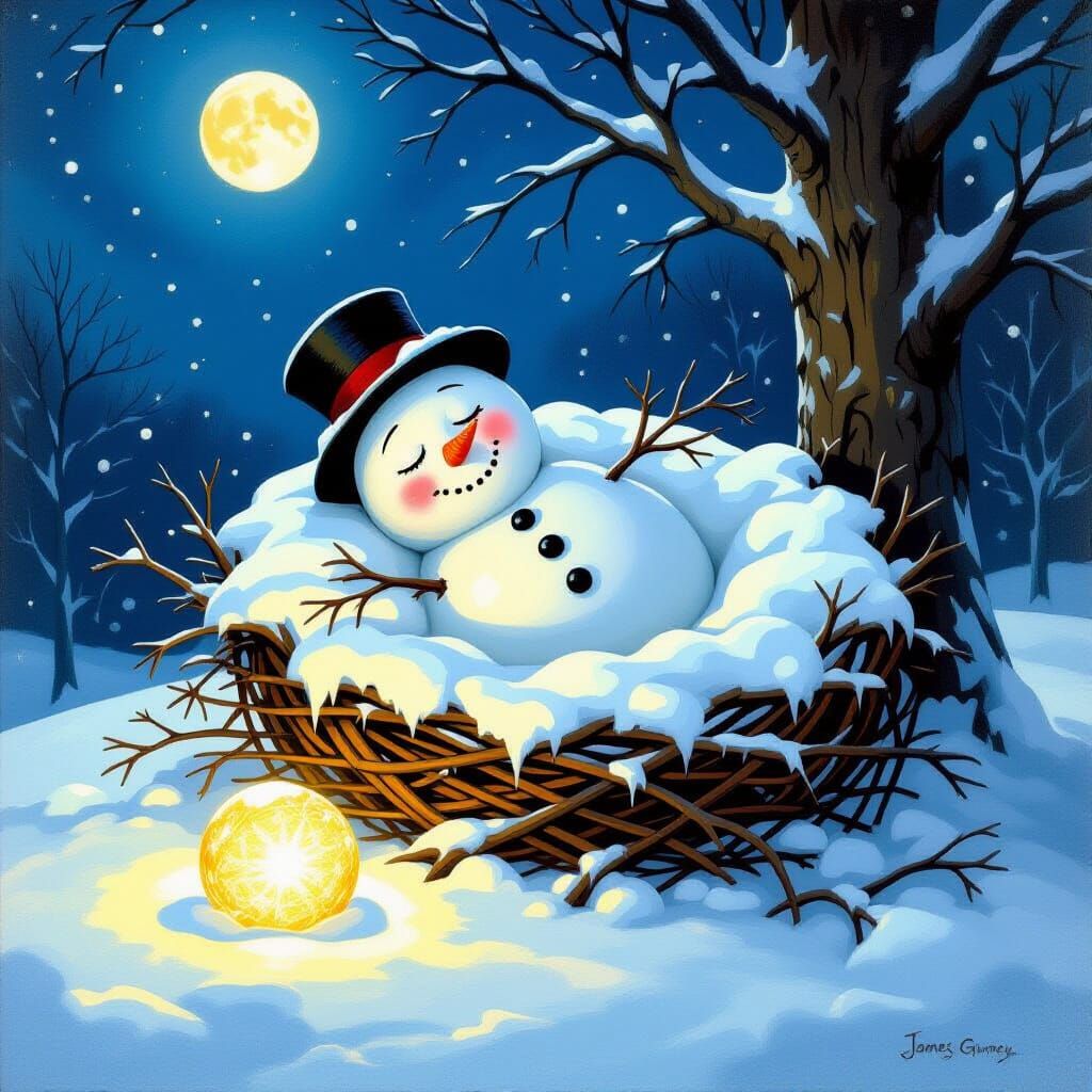 This image shows a charming snowman sleeping soundly in a snowy nest under a Christmas tree, reminiscent of James Gurney's oil painting style. A moonball rests nearby.