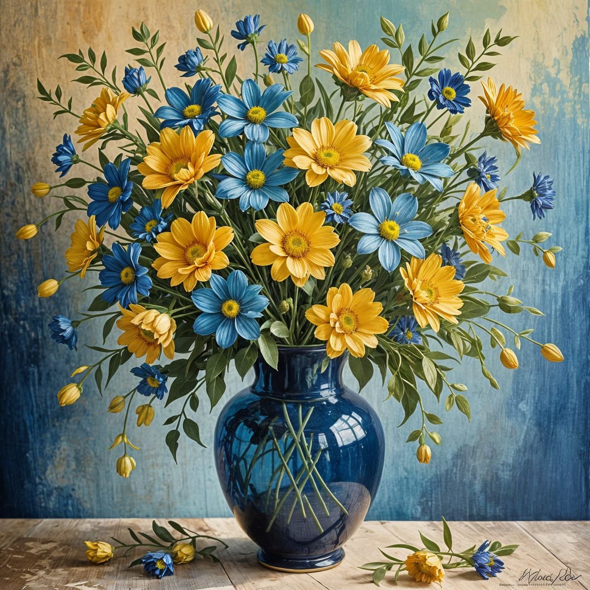 A vibrant image shows a bouquet of yellow and blue flowers arranged in a deep blue vase. The colors are striking and create a visually appealing composition.
