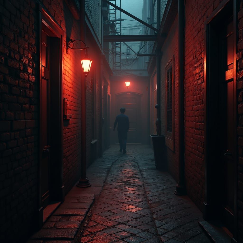 Digital matte painting. A mysterious back-alley entrance to a 1920s speakeasy is guarded by a bouncer and a secret password. The alley is dimly lit and filled with shadows. Deep color, fantastical, intricate detail, splash screen, complementary colors, fantasy concept art, 8k resolution trending on Artstation ...