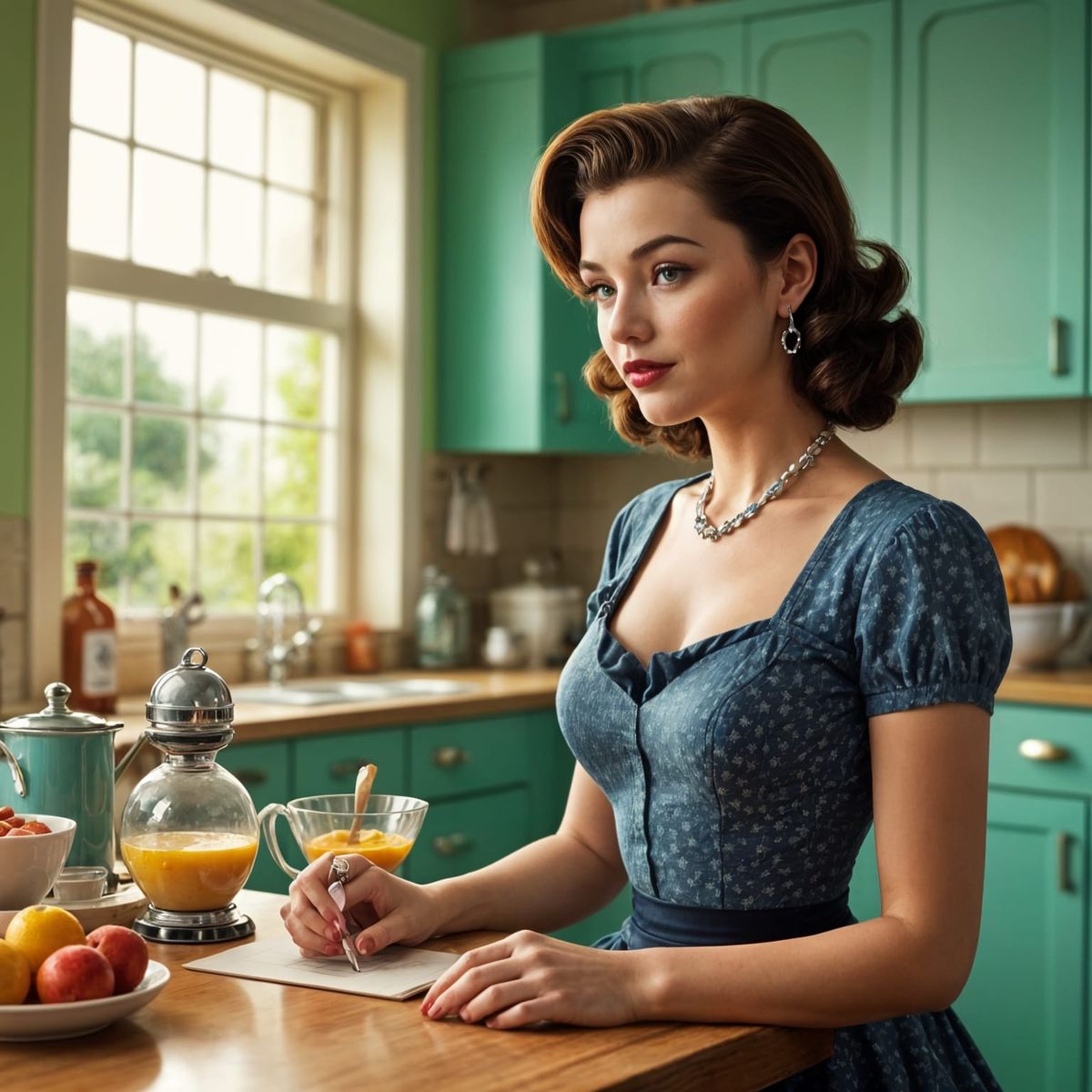 This image depicts a hyperrealistic scene of a young homemaker in a pristine 1950s kitchen, surrounded by classic appliances and period decor, as she consults a vintage cookbook.
