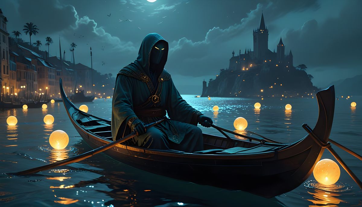 A striking picture of glowing orbs floating on dark water under a breathtaking night sky filled with stars and nebulae. A lone figure in a gondola is silhouetted against the soft, hyperrealistic lighting in a digital painting style.