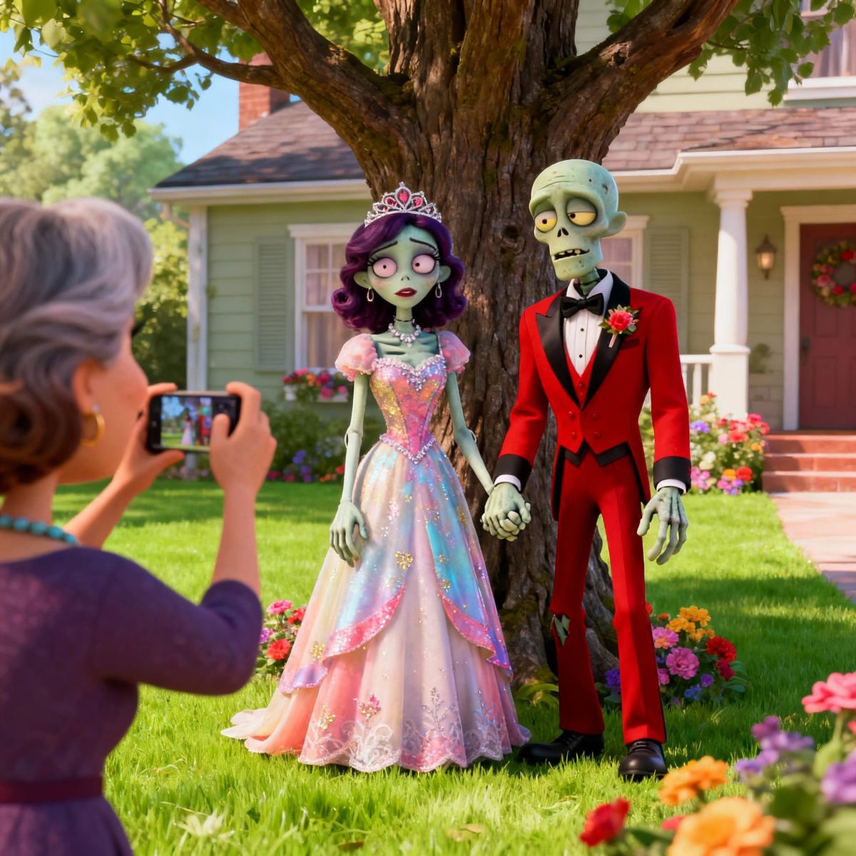 This image shows a zombie prom couple, a girl in a dress and a boy in a tuxedo, posing for a photo in their front yard. The style resembles a Disney animated movie.