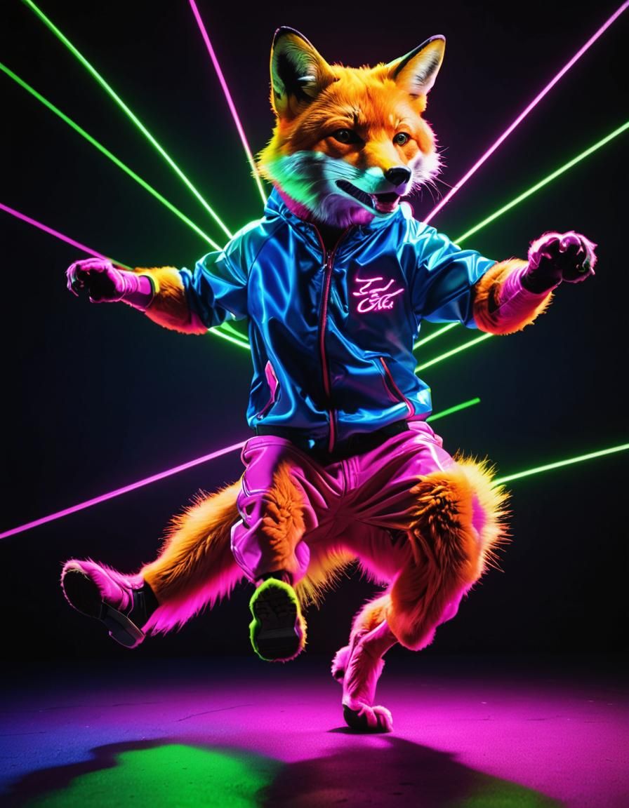 This vibrant image showcases a bold graphic style inspired by the masters of pop art, with a dynamic fox breakdancing in neon fluorescent clothing under black light, surrounded by electric blue and pink neon glow and bright green light trails.