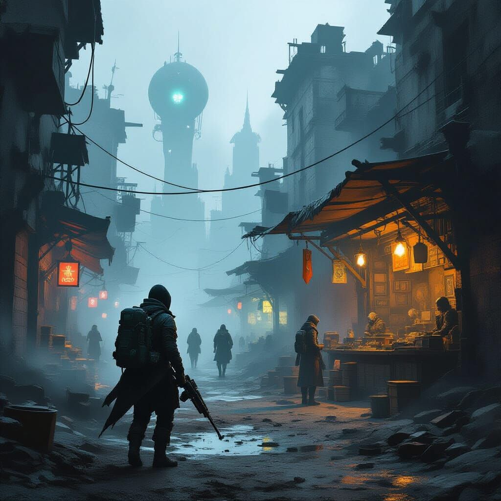 This image shows a lone explorer discovering a clandestine alien marketplace amid the crumbling remains of an ancient metropolis. The scene is depicted with gritty realism and a muted color scheme, in a post-apocalyptic style.