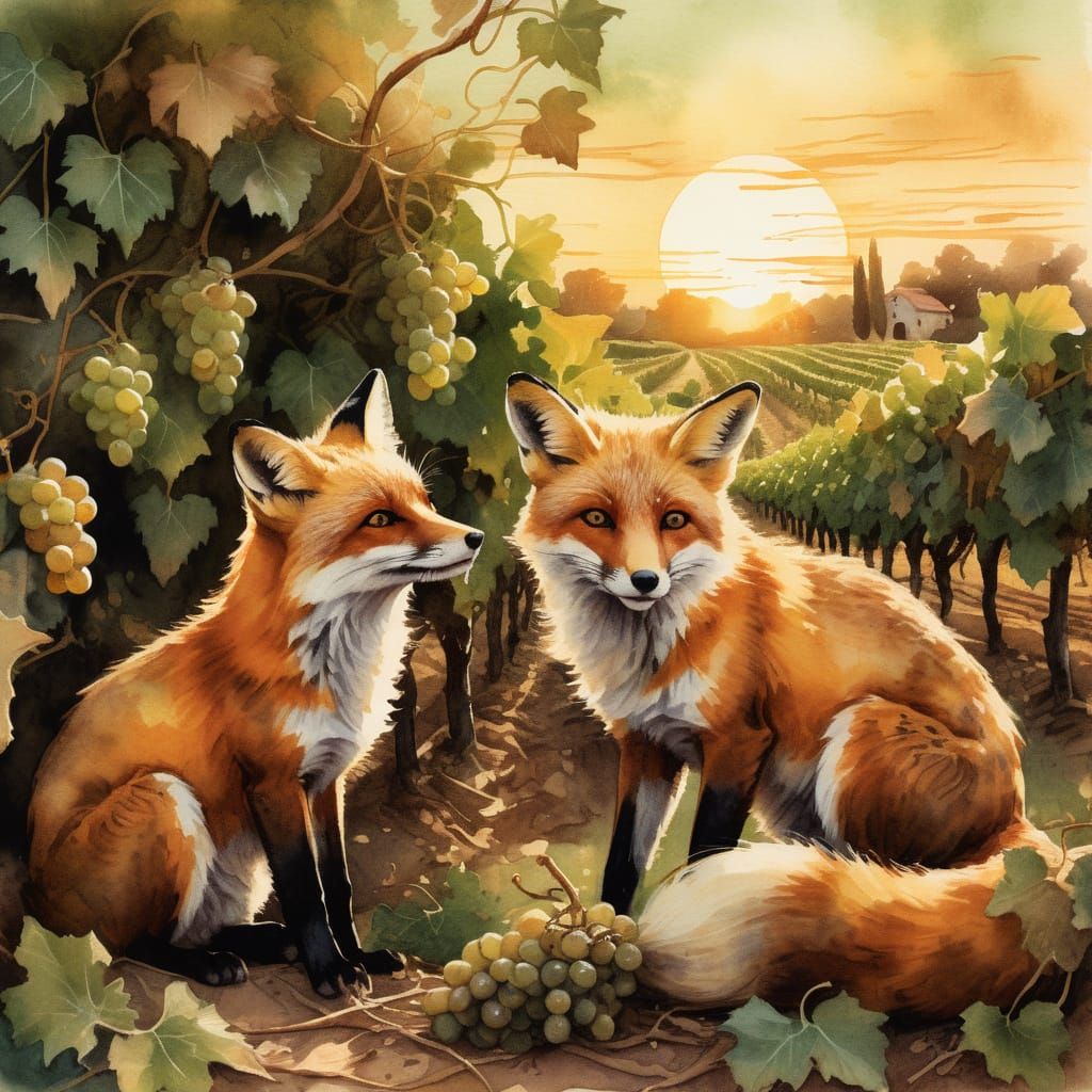 This image shows a serene scene of small foxes eating grapes in a lush vineyard under a warm sunset, created in a classic illustration style with intricate details and soft brushstrokes.
