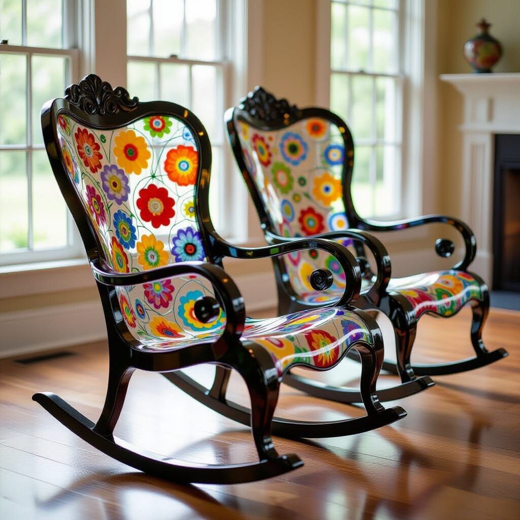 A vibrant image of intricate rocking chairs made of swirling, kaleidoscopic glass. This artwork evokes a whimsical, dreamlike atmosphere in the style of blown glass art.