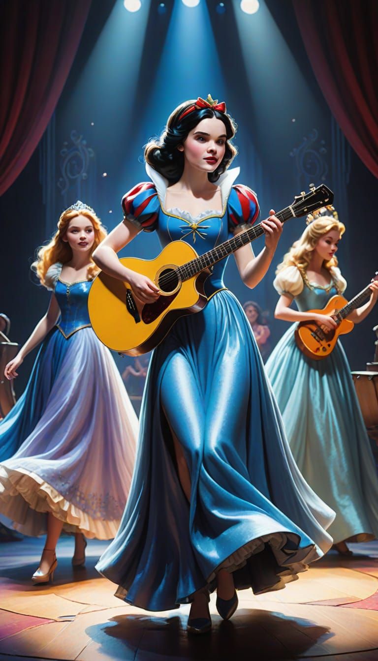 This enchanting image captures a fantastical rock band comprised of beloved Disney princesses. With vibrant colors and dynamic poses, Wendy, Alice, Cinderella, Snow White, and Aurora come alive on stage, each playing their instrument with flair. Inspired by Disney concept art, this magical scene exudes a...
