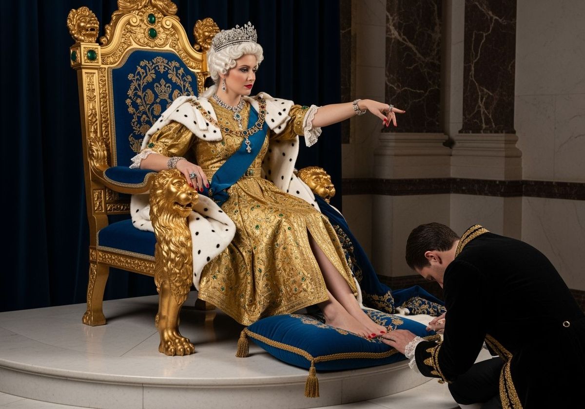 This image depicts a French Empress in golden robes seated on a throne with lion accents, resting her feet on a pillow. Set in a Versailles-style palace, a courtier kneels before her in this photograph-style image with bokeh.