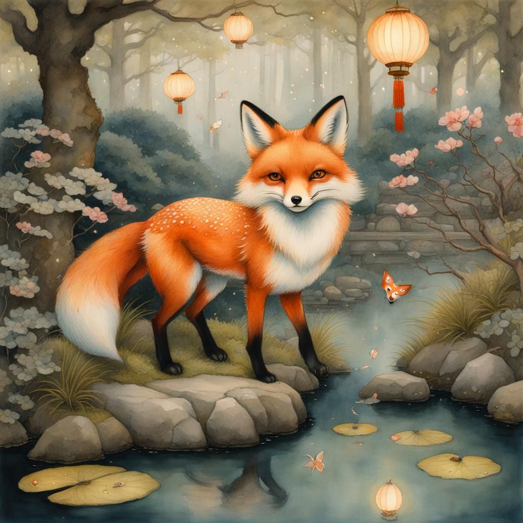 Easily generate your own Japanese garden images with our free AI tool, featuring kitsune fox and fireflies