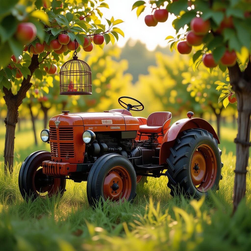 This image shows an abandoned vintage tractor in a sunlit apple orchard, with vines creeping up its wheels and an empty birdcage hanging from the steering wheel. Rendered in a mid-century comic art style with nostalgic realism.