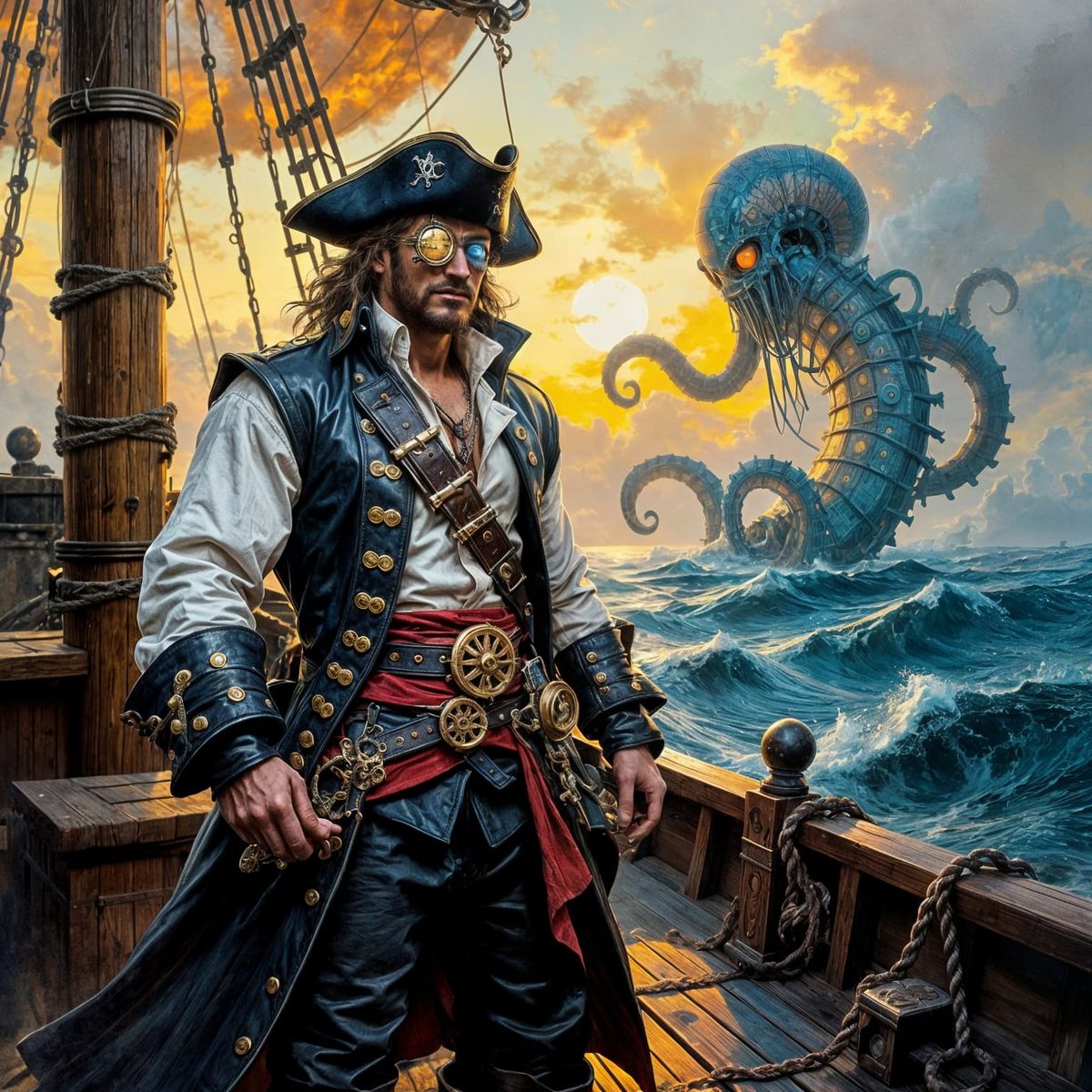 A striking picture of a pirate captain on a sinking ship as a kraken attacks. Impasto brushstrokes and vivid colors enhance the chaos, with ethereal light piercing through dark clouds in a surrealist style.