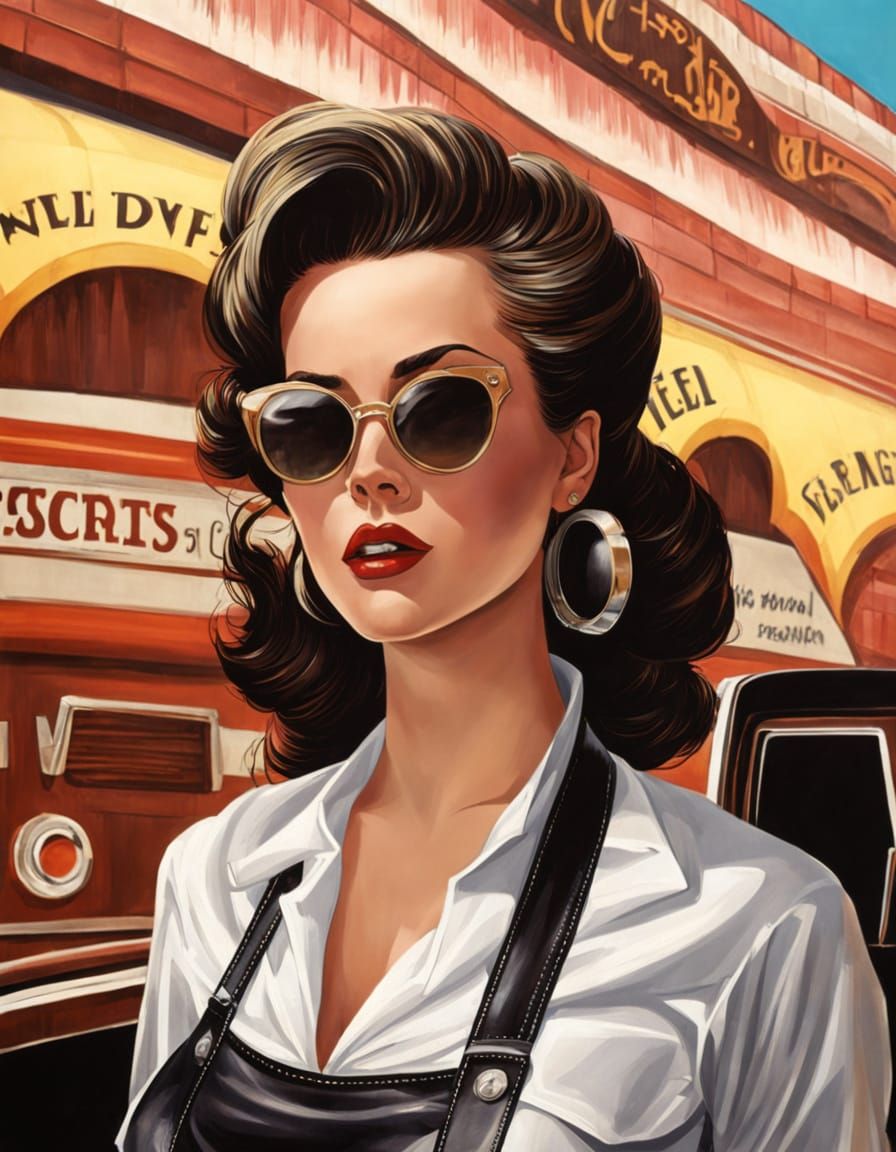 This image depicts greaser girls in high-waisted skirts and tight pants, accessorized with scarves and bandannas. The image captures the essence of the greaser subculture.