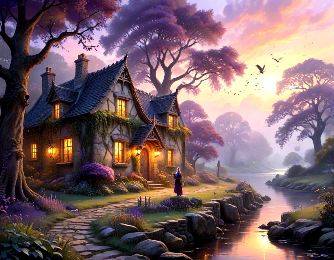 This image shows an elven warrior with a sword against a sunset backdrop. The wet watercolor style creates a dreamy, detailed scene with dark trees, crows, and a quaint stone cottage.