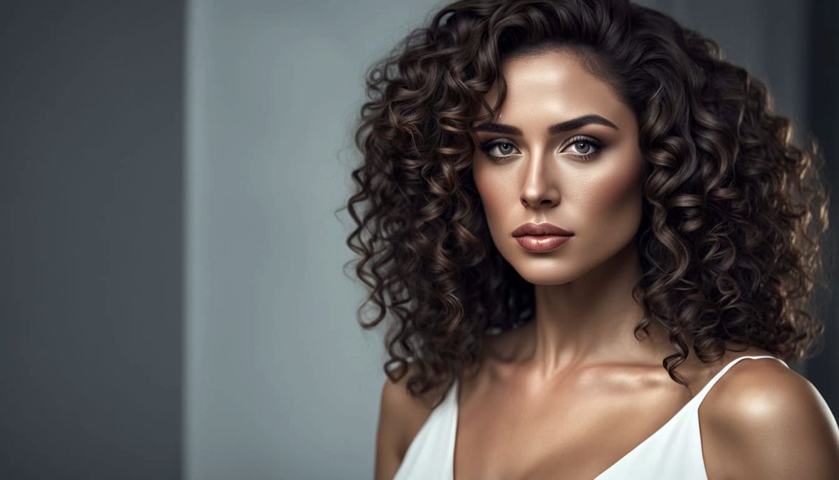 This image shows a hyperrealistic portrait of a beautiful young Colombian woman with dark curly hair and tanned skin. She wears a tight dress and poses with a seductive gaze in cinematic lighting.