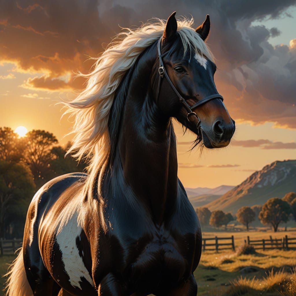 A vibrant oil painting of a majestic horse with a fluffy white mane and glossy black coat, standing in soft, natural lighting. The image evokes a cinematic fantasy concept art style.