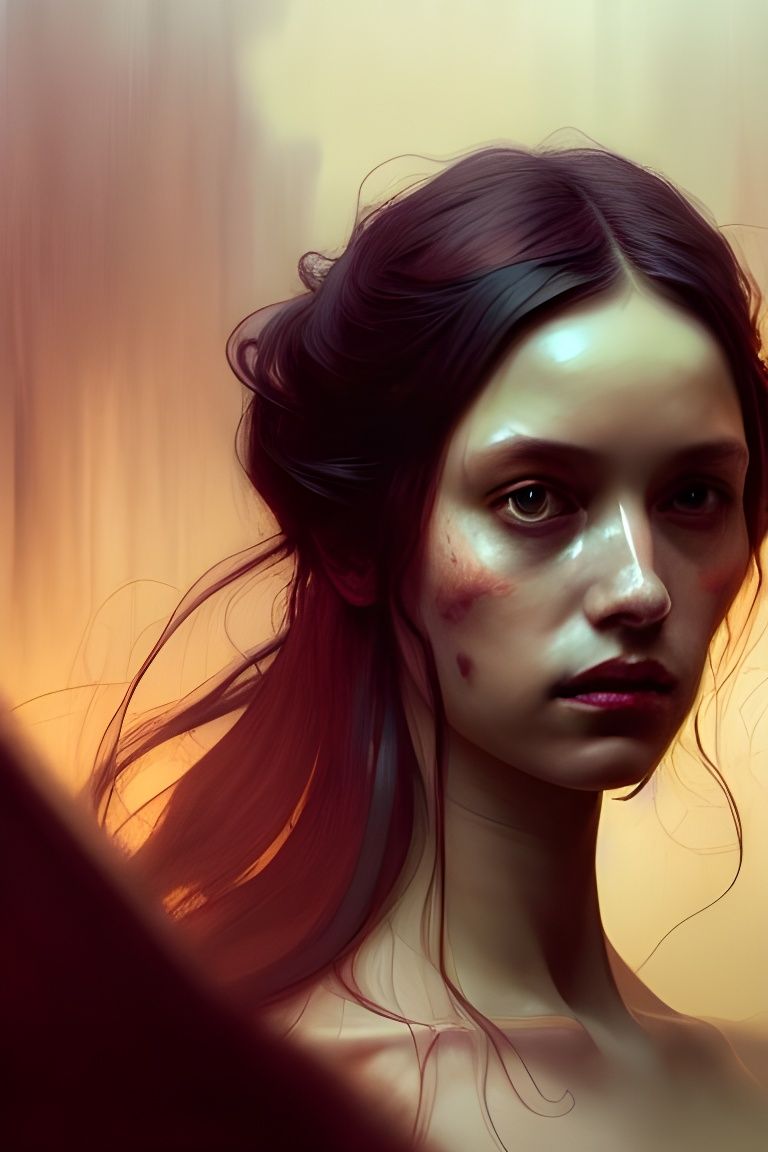 A digital portrait of a woman in a watercolor style with photorealistic elements. The artwork conveys a tragic and sinister mood through its deep colors.