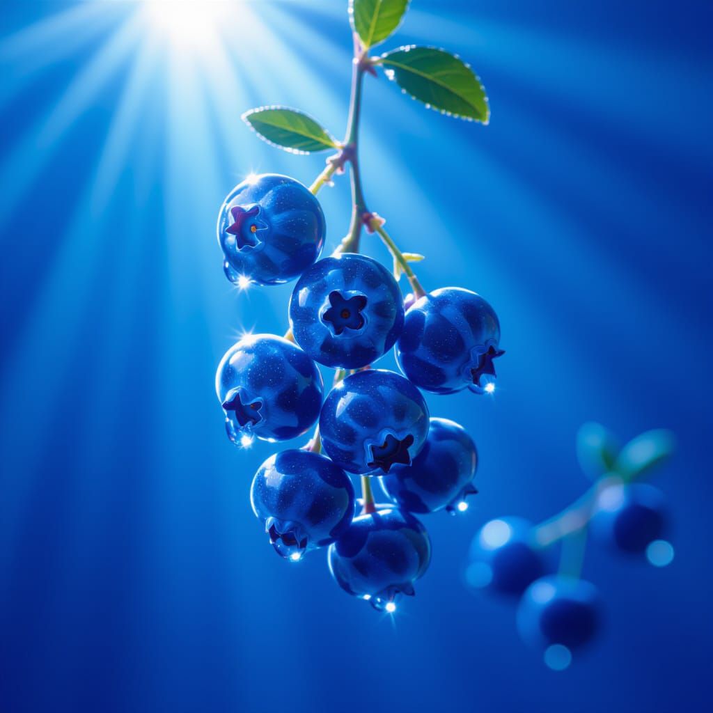 A striking picture of blueberries suspended in a beam of light. Extreme macro photography with studio lighting captures hyper-realistic details against a dark blue background, in a surreal digital art style.