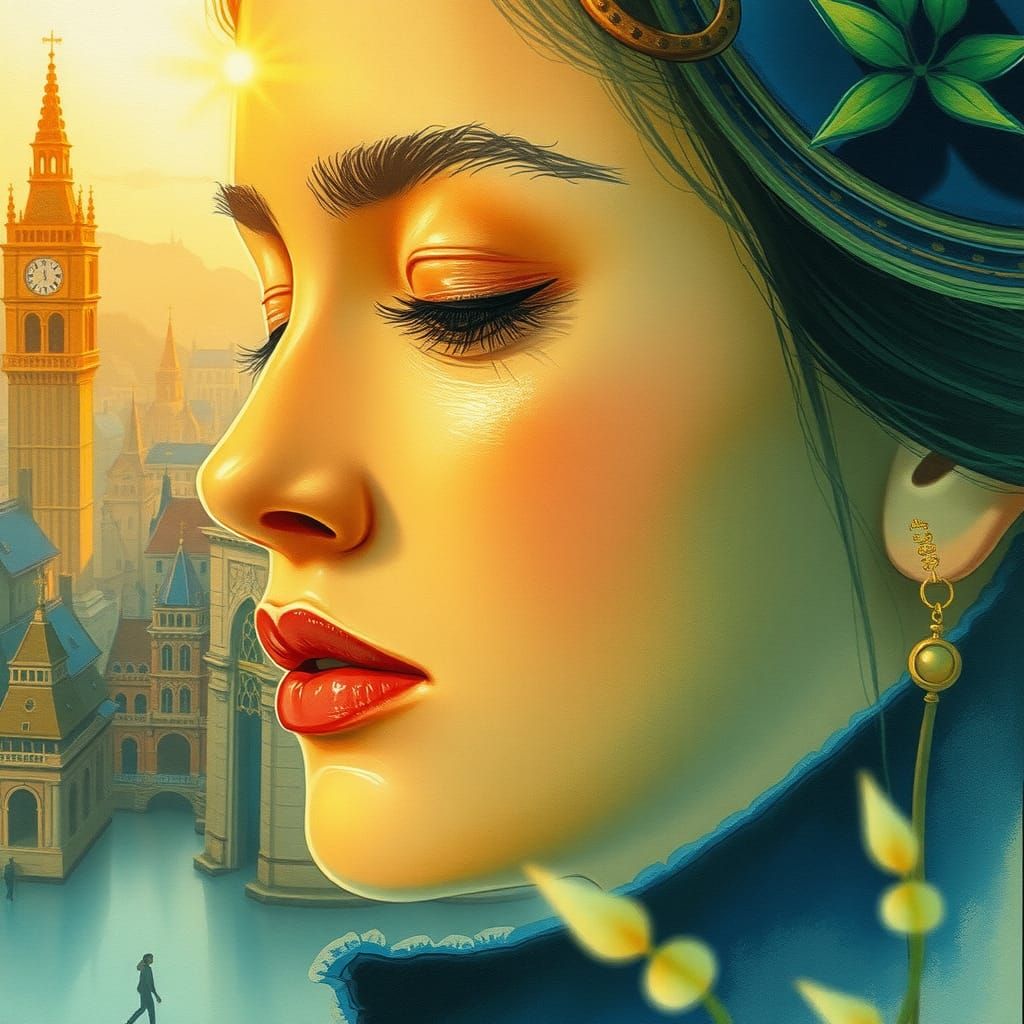 A striking picture of a woman's face in soft focus. The watercolor painting uses vibrant hues and serene tones. The backdrop features a breathtaking cityscape with intricate architectural designs, reminiscent of a matte painting.