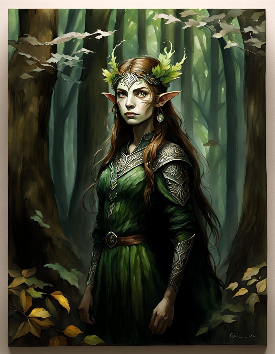 This image showcases a wood elf witch in a misty forest, rendered as an impressionistic watercolor painting with visible brushstrokes and soft, diffused lighting. Features delicate fae details and botanical elements.