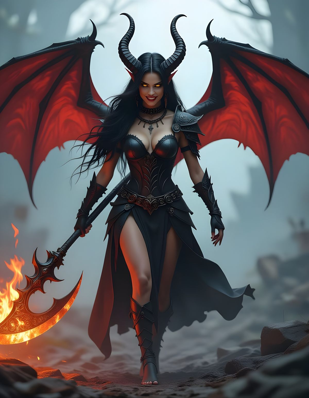 Photorealistic full-body shot of a solo female demon in mid-flight, with deep red skin, long curved horns, very large wings with black feathers, a long reptilian prehensile tail, long black hair in a full updo, piercing yellow eyes looking down with a malicious grin of evil, barely revealing her fangs. ...