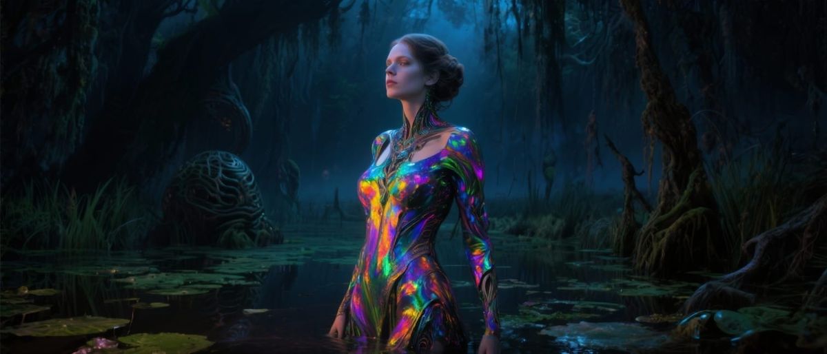 This image shows a woman with iridescent colors in a mystical swamp. It features dramatic lighting and a hyperrealistic dark fantasy atmosphere with a rich, saturated color palette.
