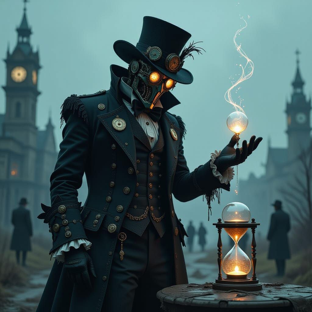 A dramatic image of a time-manipulating supervillain in Victorian attire, amidst a desolate landscape with frozen figures and decaying clock towers. The scene blends industrial and mystical elements, depicted with shimmering energy.