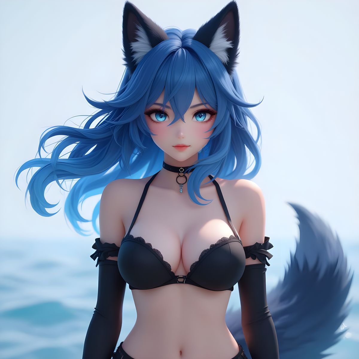 A stunning anime-style image of a wolf-girl with flowing blue hair and ocean-like eyes. The character is rendered in breathtaking detail with an aesthetic 3D quality.