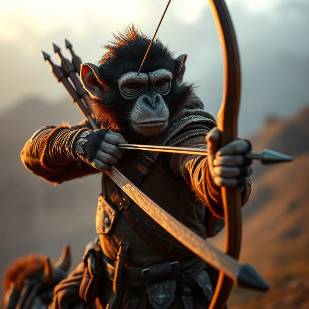 This image shows an anthropomorphic monkey ranger in leather armor with a bow and quiver, standing in a misty mountain landscape. The image is rendered with cinematic lighting and warm golden tones.