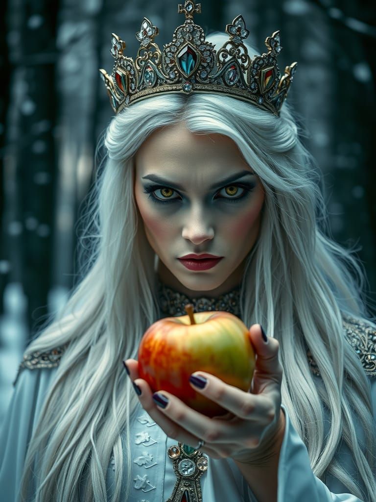A hyperrealistic image of a regal vampire queen with white hair and orange eyes, offering an apple in a moody winter forest. Cinematic lighting and sharp focus create a chilling atmosphere.