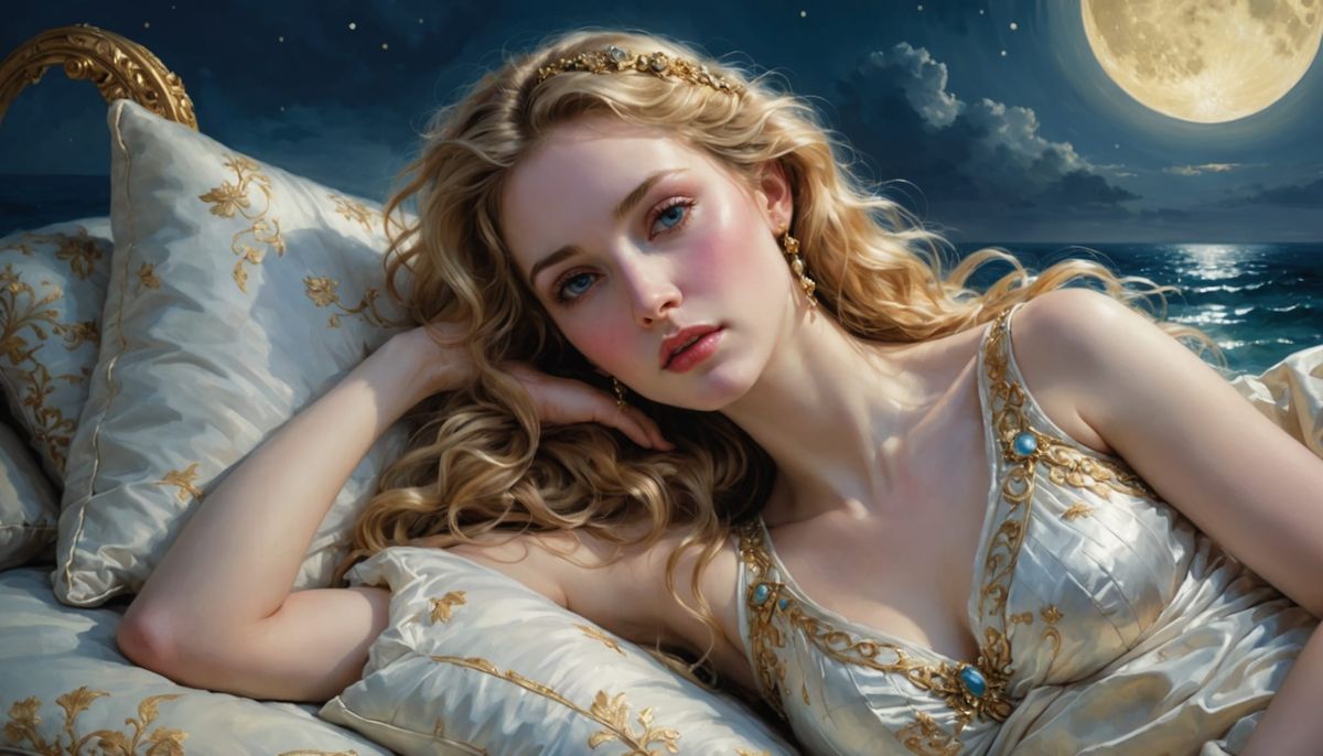 This serene image depicts the birth of the goddess of love, Aphrodite, in a mystical oriental palace setting, bathed in soft moonlight and surrounded by luxurious pillows, creating a captivating and dreamlike atmosphere.