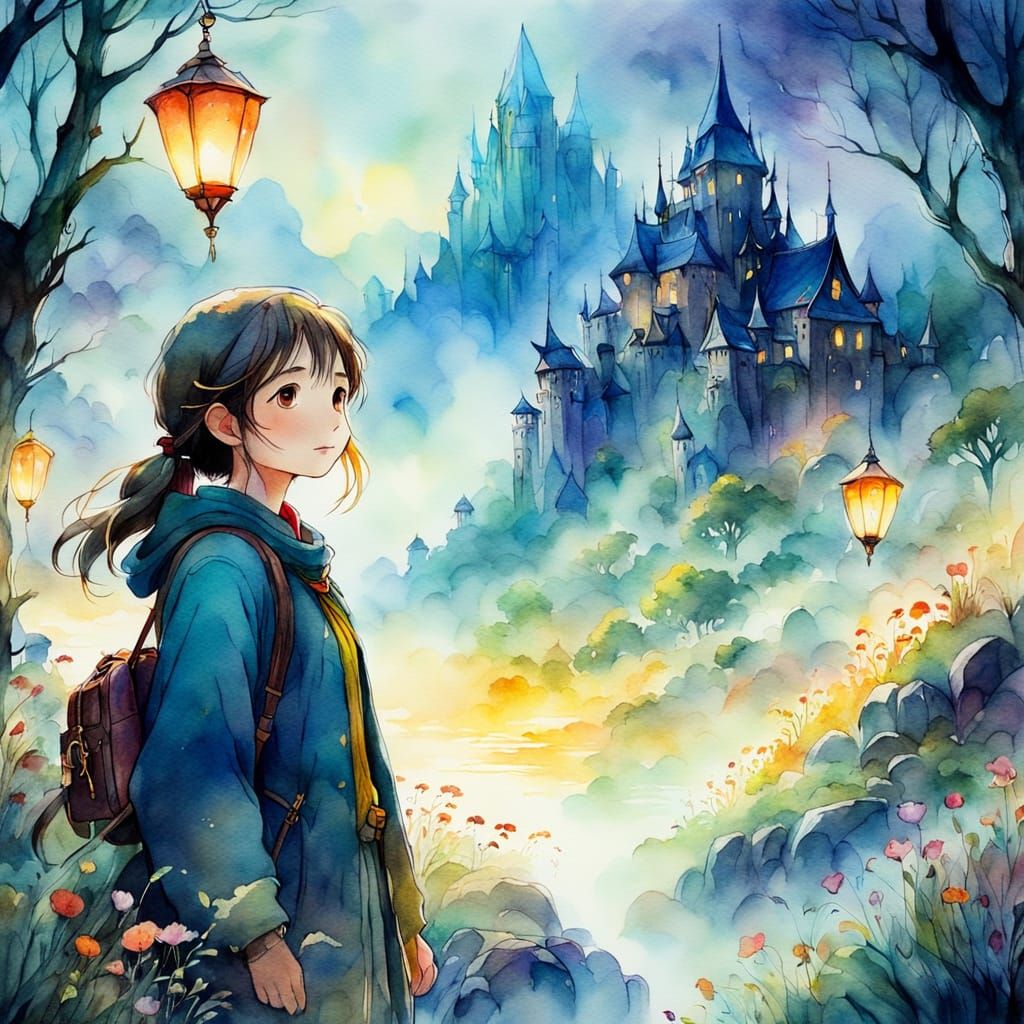 This image captures a traveler in a dreamy, ethereal fantasy world with vibrant colors and soft golden light. Features delicate brushstrokes and a misty atmosphere, evoking an adventurous, mystical journey.